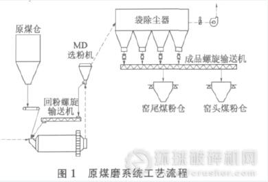 輸送機回磨繼續(xù)粉磨,成品煤粉經袋除塵器收集后由成品螺旋輸送機輸送進入煤粉倉待用。工藝流程見圖1。