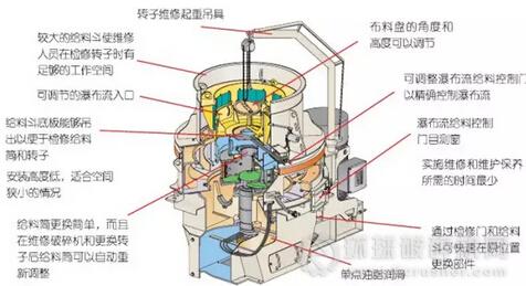 立軸沖擊式破碎機(jī)由進(jìn)料斗、吊架、渦流破碎腔、葉輪體、主軸、底座、傳動裝置及電機(jī)部分組成。其工作原理是:物料由進(jìn)料斗進(jìn)入葉輪腔內(nèi)(途經(jīng)吊架處中心進(jìn)料管),由分料錐把物料以傘狀形式均勻地拋于葉輪流道內(nèi),經(jīng)高速旋轉(zhuǎn)的葉輪瞬間加速至 60 — 75 米 / 秒,從葉輪周圍的流道腔內(nèi)拋射出去,沖擊到渦流腔內(nèi)渦流襯層上,被物料襯層反彈,斜向沖擊到渦流腔的頂部,又改變其運(yùn)動方向,偏轉(zhuǎn)向下運(yùn)動,和葉輪流道腔內(nèi)拋出的物料形成連續(xù)的物料幕。這樣,一塊物料在渦流破碎腔內(nèi)受到兩次至多次破碎撞擊,被破碎的物料由下部排料口排出,經(jīng)循環(huán)篩分系統(tǒng)形成閉路,一般循環(huán)三次即可將物料破碎成為 4.75mm 以下。這種破碎機(jī)優(yōu)點(diǎn)是破碎比與耐磨襯板的磨損無關(guān)。由于這種特性,任何物料一無論其耐磨性能如何都可以很經(jīng)濟(jì)的使用轉(zhuǎn)子離心式破碎機(jī)進(jìn)行破碎,獲得立方型顆粒含量.超過80%的高質(zhì)量產(chǎn)品。同時也提高了破碎面的比例。渦流腔內(nèi)部巧妙的氣流自循環(huán),消除了粉塵污染。溢流給料并不需要增加破碎機(jī)的功率消耗和磨損費(fèi)用,溢流給料增加了破碎機(jī)腔內(nèi)部的顆粒密度,更有效的破碎更多的顆粒,提高了能量利用率。