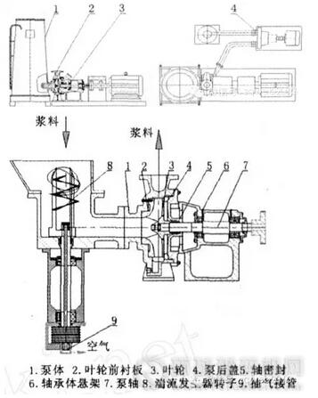 離心式低濃漿泵其結(jié)構(gòu)與離心水泵是相同的,由泵體、泵蓋、葉輪、軸,軸密封及