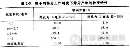 篩分過程是不平衡的,“難篩顆粒”通過篩孔慢,細(xì)粒通過篩孑L快,由于這種不平衡,就可以利用加大篩孔尺寸、降低篩分效率的辦法來提高篩子的生產(chǎn)率。例如,短頭圓錐式破碎機(jī)和篩子構(gòu)成閉路破碎中硬礦石時,破碎機(jī)固定排礦口為10毫米,檢查篩分有兩種不同的工作制度:①篩孑L為10毫米,總篩分效率為85%;②篩孔為12毫米,總篩分效率為65%。實際上這兩種工作條件所得到的篩下產(chǎn)物有著等值的比表面,即相同的平均粒度(表2—5),也就是說,篩下產(chǎn)物對碎礦而言是“等值”的,也叫“等值篩分”。