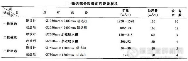 在不影響車間正常生產(chǎn)的條件下,一段磁選增加2臺Φ1050mm×2400mm磁選機(jī),二段磁選增加1臺,更新3臺Φ2800mm永磁脫水槽,三段磁選增加1臺Φ750mm×1800mm磁選機(jī),重選東粗螺拆除一組螺旋溜槽(9臺)。磁選部分改造前后設(shè)備狀況見表。