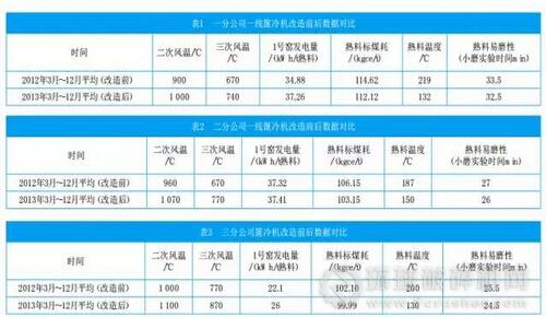 表1、表2、表3分別為一分公司一線篦冷機、二分公司一線篦冷機、三分公司篦冷機改造前后數(shù)據(jù)對比。