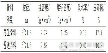 我國的混凝土構(gòu)筑物,混凝土強度等級多在C30以下。工程材料混合物中,骨料通常起骨架作用,很大程度上決定著混合物的輕度性能和耐久性能。其對強度的影響主要有兩方面:一是自身強度的影響;二是對界面結(jié)合的影響,而對耐久性的影響則是多方面的。混凝土再生骨料與普通骨料的性能列于表1。