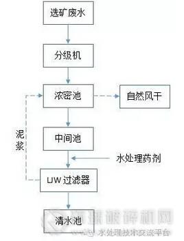 從車間出水的選礦廢水首先流入分級機(jī)去除大部分粗砂,分級機(jī)溢流液自流到濃密池,在濃密池進(jìn)一步沉淀后自流入中間池,中間池里的廢水通過管道泵抽進(jìn)LJW過濾器,在過濾器前加入水處理藥劑進(jìn)行輔助過濾器,過濾器出來的清水無色透明完全可以回用于生產(chǎn);過濾器底部每隔一段時(shí)間會排放少量泥漿回流到濃密池,這樣泥漿中殘留的藥劑也能得到充分回收利用,濃密池底部排出的泥漿流到自然干化池風(fēng)干然后運(yùn)走。