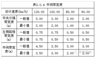 2. 按照設(shè)計(jì)速度的不同,中間帶寬度的情況如下: