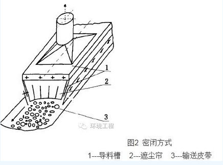 在該除塵系統(tǒng)中,首先需要的就是工藝專業(yè)的配合,對(duì)粉塵逸散點(diǎn)采取密閉措施,將塵源點(diǎn)產(chǎn)生的粉塵封閉在較小的范圍內(nèi),這才便于對(duì)粉塵進(jìn)行有組織有效的捕集,進(jìn)入除塵系統(tǒng)的料氣比得以提高,一定程度上降低除塵系統(tǒng)的規(guī)模。塵源點(diǎn)的密閉好壞,對(duì)整個(gè)除塵系統(tǒng)的大小,除塵效果和運(yùn)行經(jīng)濟(jì)性都是至關(guān)重要的。常規(guī)的密閉方式如圖2所示,通過(guò)在皮帶輸送機(jī)上設(shè)置一定長(zhǎng)度的導(dǎo)料槽,端頭加裝遮塵簾,將粉塵封閉在局部范圍內(nèi)。