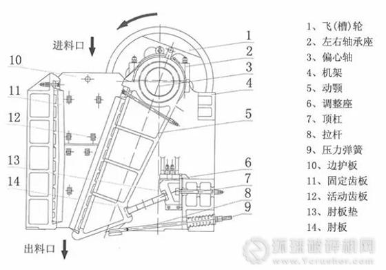 顎式破碎機(jī)的工作部分是兩塊顎板,一是固定顎板(定顎),垂直(或上端略外傾)固定在機(jī)體前壁上,另一是活動顎板(動顎),位置傾斜,與固定顎板形成上大下小的破碎腔(工作腔)。活動顎板對著固定顎板做周期性的往復(fù)運(yùn)動,時而分開,時而靠近。分開時,物料進(jìn)入破碎腔,成品從下部卸出;靠近時,使裝在兩塊顎板之間的物料受到擠壓,彎折和劈裂作用而破碎。