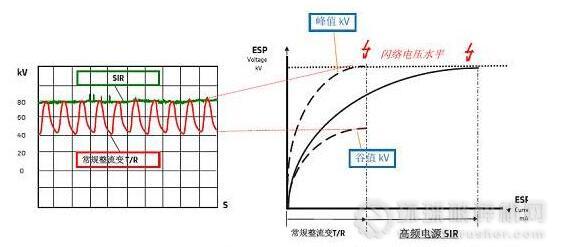 1、設(shè)計(jì)院的專家推薦高頻電源,但有些學(xué)者認(rèn)為認(rèn)為:目前在國內(nèi)范圍內(nèi)大量推廣的高頻電源并不能提高除塵效率,廠家誤導(dǎo),相反會降低除塵效率,高頻電源只是節(jié)能(甚至有專家認(rèn)為連節(jié)能也達(dá)不到)。專家指出目前國內(nèi)高頻電源廠家所宣傳的高頻電源由于低頻電源的波形圖(下圖一)來自于國外實(shí)驗(yàn)室內(nèi),并沒有國內(nèi)機(jī)組300MW或600MW的實(shí)際圖形,采用高頻電源后,電源功率會難以滿足,目前只適合于小電流電場(末電場)。并舉例說明:山西大同二電1000MW機(jī)組,除塵器采用高頻電源,灰分大時(shí),高頻電源放不出電,電流極低,造成煙道、電場堵灰,難以處理。龍凈在改造時(shí)考慮高頻電源功率的問題將一電場一分為二來解決。