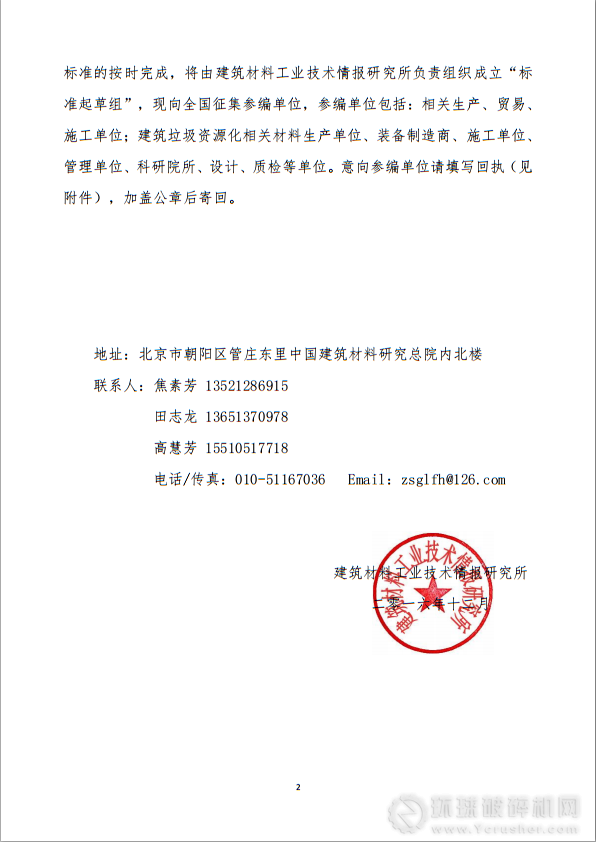 為使制定標(biāo)準(zhǔn)的內(nèi)容更加科學(xué),具有廣泛的適用性和代表性,保證標(biāo)準(zhǔn)的按時完成,將由建筑材料工業(yè)技術(shù)情報研究所負(fù)責(zé)組織成立“標(biāo)準(zhǔn)起草組”,現(xiàn)向全國征集參編單位,參編單位包括:相關(guān)生產(chǎn)、貿(mào)易、施工單位;建筑垃圾資源化相關(guān)材料生產(chǎn)單位、裝備制造商、施工單位、管理單位、科研院所、設(shè)計、質(zhì)檢等單位。意向參編單位請?zhí)顚懟貓?zhí)(見附件),加蓋公章后寄回。