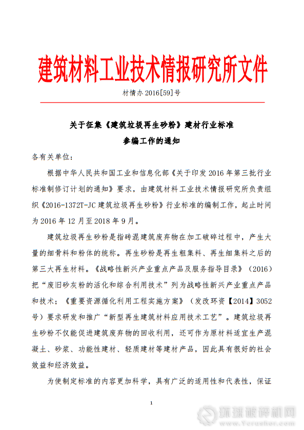 根據(jù)中華人民共和國工業(yè)和信息化部《關(guān)于印發(fā)2016年第三批行業(yè)標(biāo)準(zhǔn)制修訂計劃的通知》要求,由建筑材料工業(yè)技術(shù)情報研究所負(fù)責(zé)組織《2016-1372T-JC建筑垃圾再生砂粉》行業(yè)標(biāo)準(zhǔn)的編制工作,起止時間為2016年12月至2018年9月。
