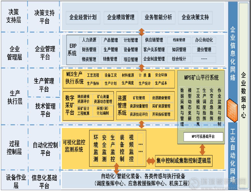 自動(dòng)化僅僅是智能化改造最具代表性的一步,智能礦山體系自下而上包括設(shè)備層、控制層、生產(chǎn)執(zhí)行層、管理層和決策支持層等關(guān)鍵層次的智能化建設(shè),還要統(tǒng)一架構(gòu)的礦山數(shù)據(jù)庫、規(guī)范的數(shù)據(jù)接口、標(biāo)準(zhǔn)化的作業(yè)流程,以及智能系統(tǒng)的支撐。