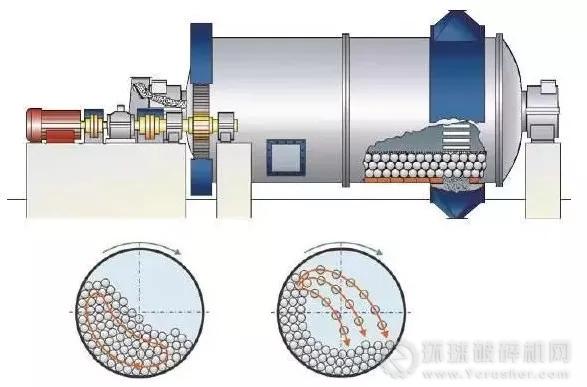 當(dāng)球磨機(jī)轉(zhuǎn)速較高時(shí),介質(zhì)拋落運(yùn)動(dòng)方式所占的比重較大,沖擊作用較強(qiáng),磨料作用以沖擊為主,磨剝次之,有利于破碎摧毀粗粒物料,球磨機(jī)出產(chǎn)能力高。