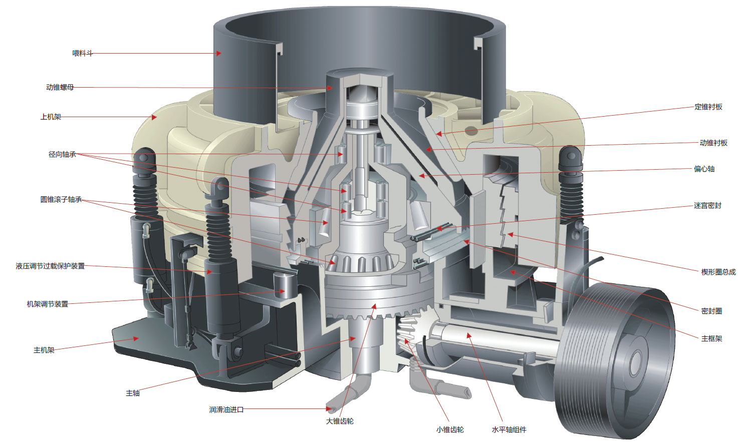 破碎機耐磨襯板的更換方法:當破碎機錐體下部襯板裝上后,利用錐體下部的調(diào)整圈,使下部襯板與錐體之間保持l.0~2.0mm的間隙。最上面的襯板裝上后,應(yīng)先將壓緊螺母裝上,然后再澆鑄鋅合金。澆鑄前,錐體與襯板先預(yù)熱60~80℃,襯板各接頭的縫隙要用石棉及黏土塞住,以免鋅合金漏出。襯板澆完合金后,裝上壓緊螺母和鎖緊板,使之緊緊固定。