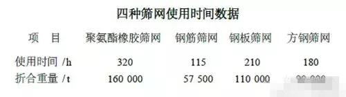 由于各個系統(tǒng)的巖石性質(zhì)及生產(chǎn)工況的不同,篩網(wǎng)使用壽命也會存在一定的差異,為了更好的對四種不同篩網(wǎng)使用壽命進行比較,現(xiàn)只針對四種篩網(wǎng)在某人工骨料加工系統(tǒng)的使用情況進行比較。