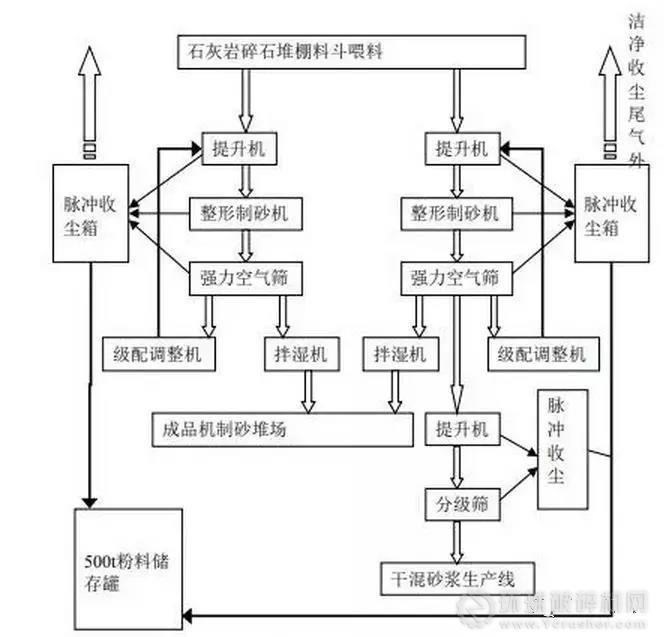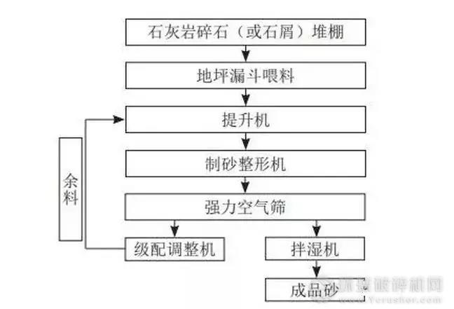 制砂機(jī))、強(qiáng)力空氣篩和級配調(diào)整機(jī)處理,出料即為成品機(jī)制砂,余料返回提升機(jī)再循環(huán)處理。