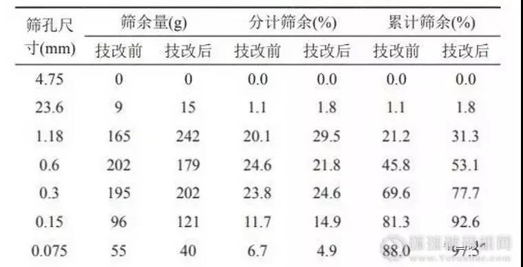 表1 技改前后機(jī)制砂篩分結(jié)果對比