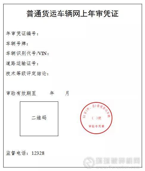 審驗符合要求的,道路貨物運(yùn)輸經(jīng)營者可通過全國互聯(lián)網(wǎng)道路運(yùn)輸便民政務(wù)服務(wù)系統(tǒng)下載《普通貨運(yùn)車輛網(wǎng)上年審憑證》(參考樣式見附件1)并留存。電子印章(參考樣式見附件1)標(biāo)注在《普通貨運(yùn)車輛網(wǎng)上年審憑證》上,由審驗機(jī)關(guān)加蓋。