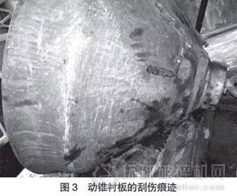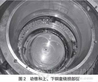 ?。?)有金屬物、木塊和橡皮等異物進入破碎腔,導(dǎo)致2號動錐在旋轉(zhuǎn)時受力不均勻,發(fā)生嚴(yán)重偏斜,傾斜角度超過允許的最大值,造成動錐上銅套直接與碗形瓦的鋼支架發(fā)生硬性碰撞,使動錐上銅套磨損,進而使動錐下銅套與偏心套的間隙縮小。