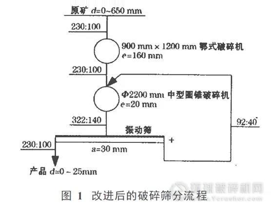 通過理論計算,各破碎篩分設(shè)備在調(diào)整排礦口和破碎比之后,其計算的處理能力都符合各設(shè)備的理論處理能力。將該二級破碎篩分流程調(diào)整后見圖1: