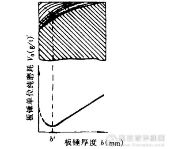 板錘磨損到一定程度后,在磨損面上堆焊硬質(zhì)合金也是一種有效的辦法,從圖中可以看出,在板錘厚度方向上,當(dāng)板錘磨損到b?點(diǎn)時(shí),板錘單位純磨耗最小。在板錘磨損到b?點(diǎn)附近時(shí)進(jìn)行硬質(zhì)合金堆焊,可達(dá)到理想效果。