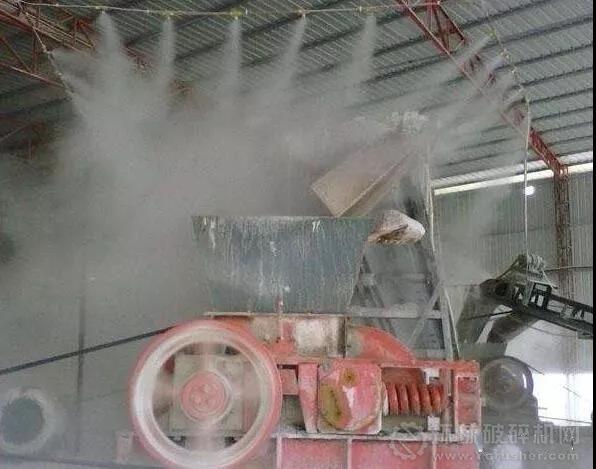 在骨料進(jìn)入粗碎站以及中細(xì)碎站前,噴水加濕,可以有效降低骨料破碎環(huán)節(jié)中所產(chǎn)生的粉塵;
