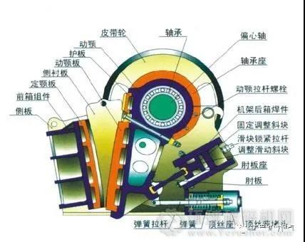 另一對軸承裝在動顎與偏心軸之間,通常稱為動顎軸承,支承動顎在偏心軸回轉時作擺動運動,從而實現(xiàn)活動顎板周期性的靠近與遠離固定顎板。
