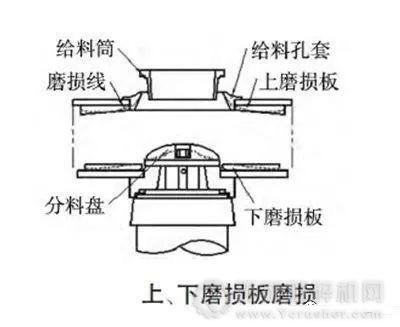 上磨損板非正常磨損主要因給料筒及給料孔套磨損嚴(yán)重,需有針對性的檢查給料筒及給料孔套的磨損情況并進(jìn)行更換(上磨損板內(nèi)側(cè)邊緣磨損至3mm時(shí)更換),同時(shí)觀察轉(zhuǎn)子拋料頭磨損位置,確定是否受導(dǎo)料板安轉(zhuǎn)位置和安裝角度影響。