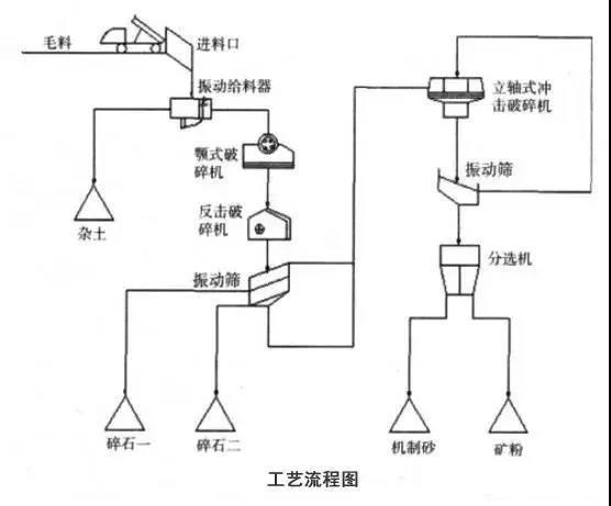顎式破碎機(jī)破碎的回料及部分不同粒徑的石料進(jìn)入制砂機(jī),分離出不符合級(jí)配要求粒徑的石粉形成機(jī)制砂。