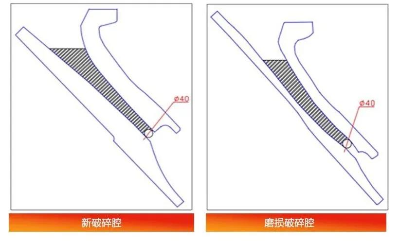 為了更好地理解容積能力,下圖展示了兩個(gè)腔型??梢钥闯?,磨損后破碎腔的容積能力有所減小。與新破碎腔相比,容積能力越小的破碎腔,每小時(shí)處理量越低。這是在相同的緊邊排料口(如40mm)條件下進(jìn)行比較。因?yàn)?,如果增大緊邊排料口,雖然可以增加容積能力,但是會(huì)降低產(chǎn)品質(zhì)量。