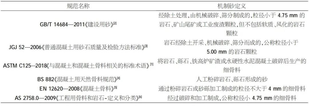 目前,國內(nèi)外標(biāo)準(zhǔn)規(guī)范中機制砂的定義并不統(tǒng)一,不同國家的機制砂定義各不相同,國內(nèi)各標(biāo)準(zhǔn)中機制砂的定義也不同,詳見表1。