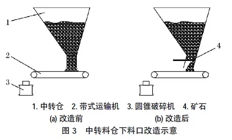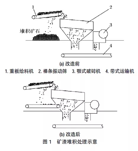 ?。?)如圖1所示,在重板給料機(jī)下方增加1臺(tái)帶式運(yùn)輸機(jī),給料機(jī)掉落的礦渣直接落在輸送機(jī)上,由其運(yùn)送至振動(dòng)篩下料口的輸送帶上,解決了重板給料機(jī)下方堆積凍結(jié)礦渣的現(xiàn)象。