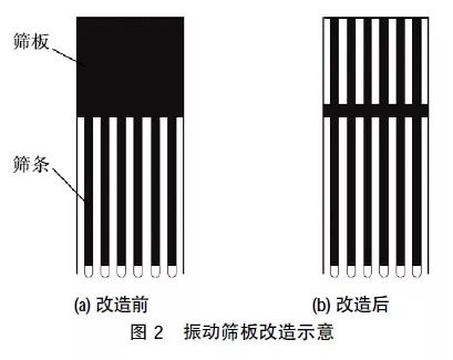 ?。?)振動(dòng)篩落料處錳板寬1500mm,長1000mm,將該處的錳板加厚,并將錳板同棒條對齊割成條形,形成條形篩網(wǎng),如圖2所示,解決了礦渣堆積現(xiàn)象,避免經(jīng)常停車清理礦渣。