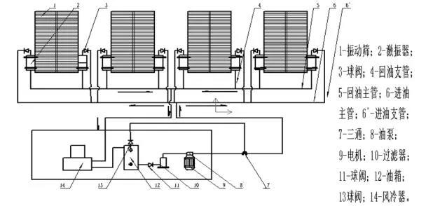 從圖3中可知:激振器整個(gè)潤(rùn)滑系統(tǒng)由兩部分組成。一是工作潤(rùn)滑部分,另是稀油站循環(huán)部分。工作潤(rùn)滑部分是由激振器(2)、球閥(3)、回油支管(4)、回油主管(5)、進(jìn)油主管(6)、進(jìn)油支管(6’)等組成;稀油站循環(huán)部分是由油泵(8)、電機(jī)(9)、過(guò)濾器(10)、球閥(11和13)、油箱(12)、風(fēng)冷器(14)及進(jìn)回油管線組成。