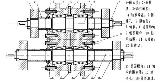 從圖2可以看出:在激振器殼體(5)側(cè)面分別鉆通進(jìn)油孔(15)和回油孔(6),在原來(lái)軸承凹迷宮端蓋的基礎(chǔ)上加裝兩個(gè)骨架油封(16)改為軸承端蓋(4),同時(shí)在原來(lái)凸迷宮端蓋上改為內(nèi)鑲兩道“O”形圈的油封軸套(3),另外在長(zhǎng)、短傳動(dòng)軸(8)、(12)的軸承(7)的軸向位置上,各增加一個(gè)軸承內(nèi)圈墊圈(14),壓緊軸承。