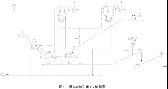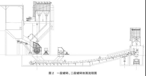 一級單段錘破(或重錘反擊破)進料斗上方處設集中收塵系統(tǒng)和噴霧降塵系統(tǒng),一級及二級破碎機設集中收塵系統(tǒng)。一段破碎、二段破碎工藝流程見圖2: