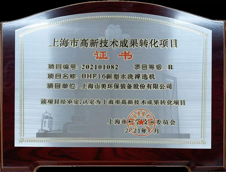 上海山美股份自主創(chuàng)新研發(fā)的專利產(chǎn)品BHF16新型水洗浮選機(jī)成功通過上海市高新技術(shù)成果轉(zhuǎn)化項目認(rèn)定辦公室專家組評審,認(rèn)定為上海市高新技術(shù)成果轉(zhuǎn)化項目。上海山美股份水浮選專利技術(shù)還榮獲了第21屆中國專利優(yōu)秀獎,在去年12月14日召開的中國砂石協(xié)會2020年年會上,作為中國砂石協(xié)會2020年度大獎,中國砂石協(xié)會相關(guān)領(lǐng)導(dǎo)為上海山美股份頒發(fā)了“中國專利優(yōu)秀獎”證書。