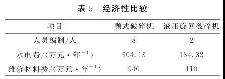 可以看出:液壓旋回破在生產(chǎn)過程中較顎破人員編制可減少75%,材料維修費減少56.38%。采用液壓旋回破作為粗碎設備可在人員工資、能耗和維修費等方面為企業(yè)節(jié)約上百萬元成本。