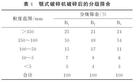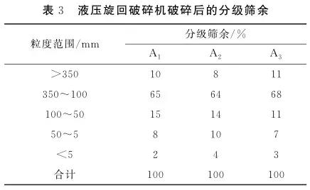 可以看出,經(jīng)過液壓旋回破破碎后,粒度在350mm 以上的物料質(zhì)量分數(shù)較顎破的約低13個百分點;5mm 以下物料質(zhì)量分數(shù)兩者相差不大,均為3%左右。液壓旋回破和顎破破碎后的物料粒度大多為350-100mm,但液壓旋回破的物料質(zhì)量分數(shù)比顎破高20%以上,說明在大型礦山生產(chǎn)中,液壓旋回破破碎后的效果更優(yōu),后續(xù)的中碎設備生產(chǎn)壓力更小。