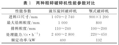 結合2500t/h的設計產(chǎn)能,若選用顎破,至少需10臺,而液壓旋回破2臺即可滿足要求,設備管理簡單,且總設備功耗明顯小于顎破。