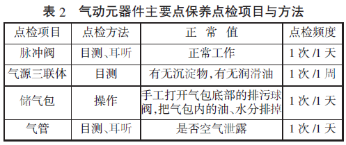 項(xiàng)目與方法如表2所示。儲(chǔ)氣罐、氣源三聯(lián)件中的油水分離器應(yīng)每班排污一次,同時(shí)油水分離器應(yīng)每隔3~6個(gè)月清洗一次,防止壓縮空氣中過多的水分進(jìn)入氣控閥內(nèi)造成閥芯堵塞導(dǎo)致動(dòng)作異常,另外儲(chǔ)氣罐內(nèi)一旦存水脈沖時(shí)就容易隨脈沖閥噴吹到布袋上去,弄濕布袋,再吸塵時(shí)造成板結(jié),時(shí)間長了損壞布袋。油霧器應(yīng)經(jīng)常檢查存油情況,及時(shí)加油。