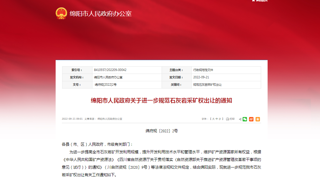 綿陽市人民政府關(guān)于進(jìn)一步規(guī)范石灰?guī)r采礦權(quán)出讓的通知綿府規(guī)〔2022〕2號
