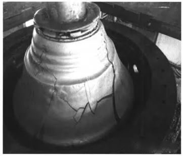 破碎機(jī)過鐵瞬間,運(yùn)行功率、壓力急劇升高,排礦口放大,若鐵物尺寸較大(如大塊鉆頭、牙尖、條形襯板等)卡在破碎腔內(nèi)不能自行排出,在持續(xù)的高功率和高壓力下極易造成主軸橫斷及軀體裂紋。主軸軀體損傷如圖10所示,主軸上部橫斷如圖11所示。