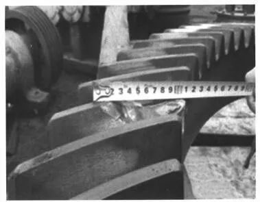 破碎機(jī)過鐵瞬間傳動(dòng)齒輪嚙合受到?jīng)_擊,易造成打齒。大齒輪損傷如圖8所示,小齒輪損傷如圖9所示。