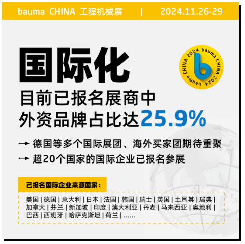 歷經(jīng)四年沉淀,bauma CHINA 2024將于明年11月26-29日強勢回歸!31萬平米展示面積,預(yù)計匯聚3000+國內(nèi)外參展商。目前國際品牌、國家展團報名踴躍,行業(yè)急需面對面溝通交流未來的發(fā)展,bauma CHINA 2024 將在更開放的經(jīng)貿(mào)環(huán)境下,以二十余年自身積淀,深入做強“國際化”優(yōu)勢,為亞洲工程機械行業(yè)提供“久違”的實地挖掘新產(chǎn)品、面對面采購交流、洞察行業(yè)變革的平臺。