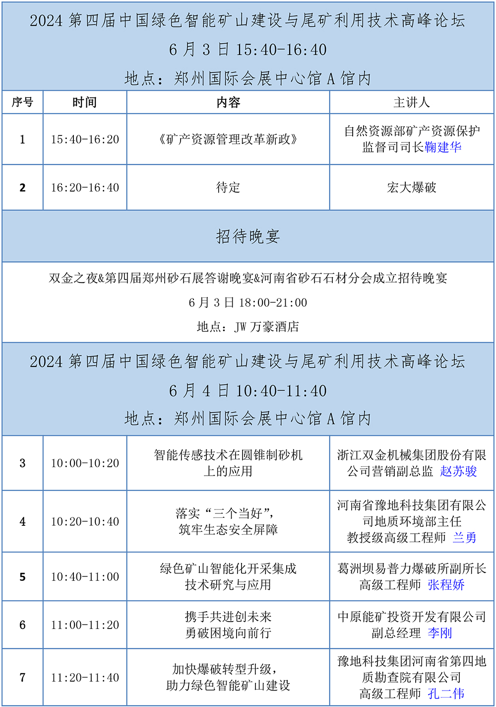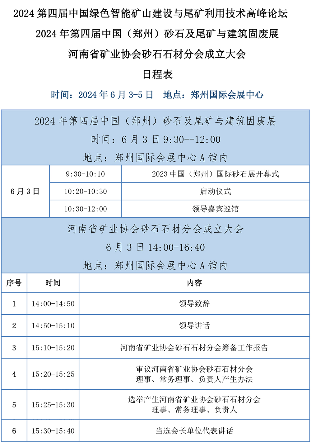 由河南省礦業(yè)協(xié)會、河南省自然資源投資集團、河南省豫地科技集團、河南省地質(zhì)研究院、環(huán)球破碎機網(wǎng)聯(lián)合主辦的“2024第四屆中國綠色智能礦山建設(shè)與尾礦利用技術(shù)高峰論壇”,將于2024年6月3日-5日在河南鄭州舉辦,同期舉辦“第四屆中國(鄭州)砂石及尾礦與建筑固廢處理技術(shù)展覽會”、“礦業(yè)先進技術(shù)裝備展”、“河南礦業(yè)協(xié)會砂石石材分會成立大會”等活動。