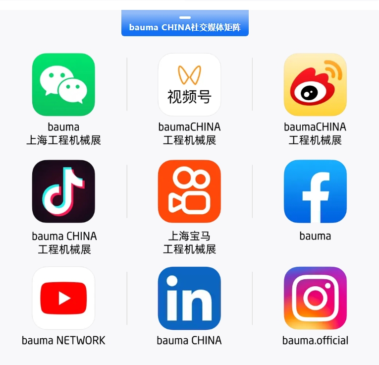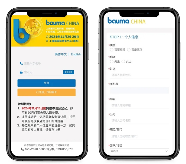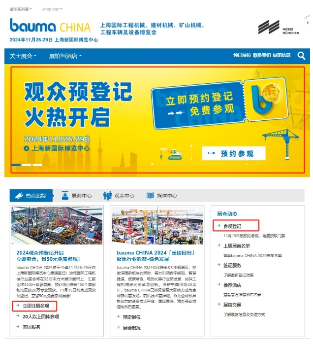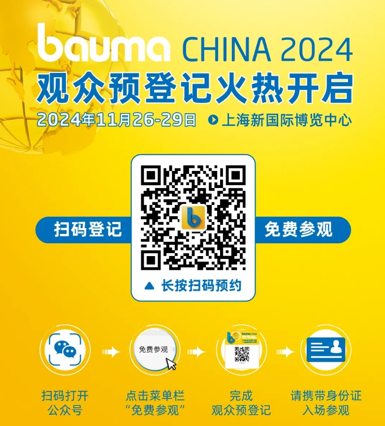 bauma CHINA 2024同時(shí)開啟了展會(huì)網(wǎng)站(中、英文版)、微信公眾號(hào)兩個(gè)渠道的觀眾預(yù)登記。