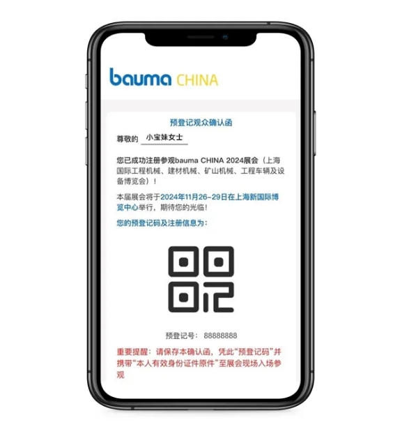 獲取預(yù)登記確認(rèn)函/電子胸卡:填寫所有表單后即可成功完成參觀預(yù)登記,您將收到預(yù)登記確認(rèn)函/電子胸卡。