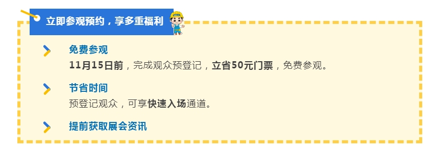 11月26-29日展會(huì)期間,請(qǐng)憑預(yù)登記確認(rèn)函/電子胸卡并攜帶本人有效身份證件原件入場(chǎng)參觀。